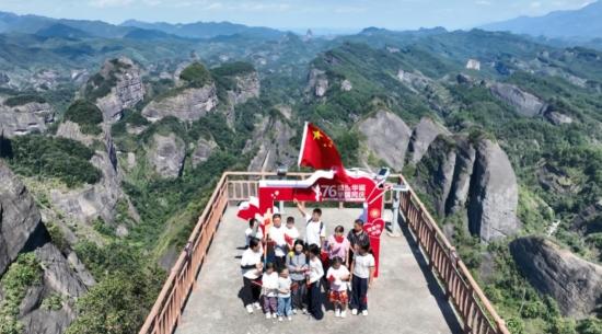 崀山八角寨境内,连绵起伏的赤壁丹崖被秋色染透,缥缈云海在峰峦间缓缓流淌,勾勒出“鲸鱼闹海”的经典奇观,引得游客阵阵惊叹。景区内,鲜艳的五星红旗迎风招展,灯笼、彩带等国庆主题装饰点缀在步道旁与观景台边,与穿梭的游客身影相融。游客们热情高涨,有的乘坐观光缆车缓缓升空,将丹霞盛景尽收眼底;有的选择徒步攀登,拾级而上感受登山乐趣。行至视野开阔的山顶观景台,大家纷纷驻足,或凝望远方如诗如画的山水长卷,或举起相机、手机拍照打卡,定格假期的欢乐瞬间。“这个‘十一’小长假,我们全家专门来崀山游玩,今天爬了八角寨,从山下到山上一路都是美景,尤其是亲眼看到‘鲸鱼闹海’,那种震撼的感觉一辈子都忘不了!”来自长沙的游客陈女士笑着说道。