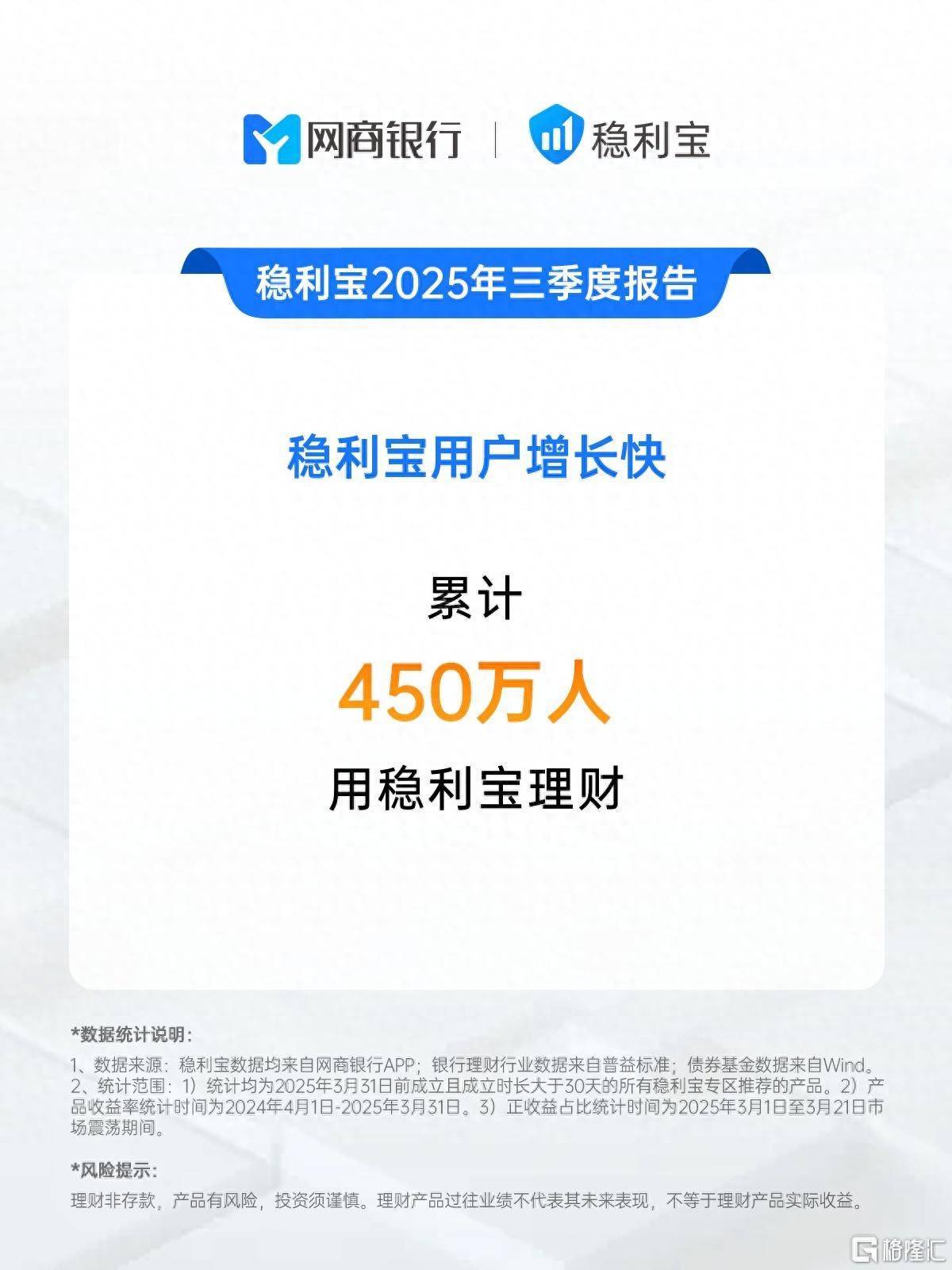 以网商银行旗下“稳利宝”平台为例,其2025年三季度报告进一步揭示了用户行为的微观特征。截至9月末,平台用户规模达450万人,较年初增长67%。用户投资行为也呈现出黏性增强的特征,约三分之二的新用户进行复投,超七成用户在复购时会增加投资金额。这一方面说明用户对平台及产品策略的认可,另一方面也反映出理财习惯从“一次性尝试”向“持续性配置”转变的趋势。