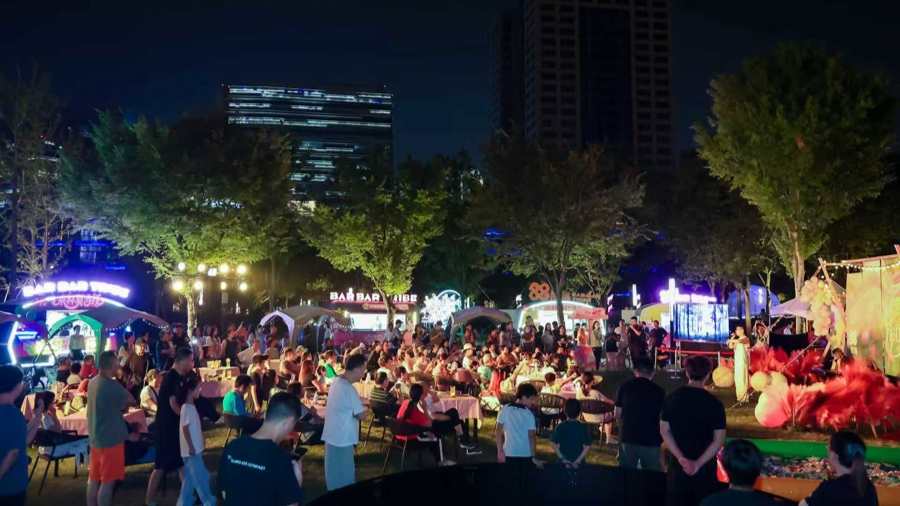 航程连接着岸上的新风景。在长风公园码头,不远处的“周同学”卡通雕塑与精心打造的粉色主题梦幻运动场,吸引市民争相打卡;“88部落”苏河市集则汇聚了餐饮、文创、零食、潮玩四大品类,9辆特色餐车与15个集市摊位沿河岸线排开,香气四溢。市集主办方表示,以知名文化IP‘周同学’为纽带,通过‘文化赋能+场景创新+消费升级’模式,打造普陀苏州河特色的文旅新标杆。市集现场,国庆首日的“苏河足球之夜”点燃全城热情,随后的粉色甜品DIY、专业调酒师特调等活动,让灯光、美酒、音乐与河景共同构成了一幅流动的都市风情画。